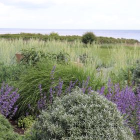 De fine cremefarvede sommerfloks ‘Creme Brulée’ har en farve i bunden af blomsten som matcher både klematis, prydoregano ‘Herrenhausen’ og de umodne brombær.